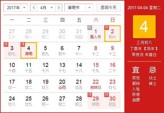 關(guān)于2017年清明節(jié)假日安排的通知:2017年4月2日--4月4日共3天。4月2日(星期日)、4月3日(星期一)、4月4日(星期二、農(nóng)歷清明節(jié))放假。4月5日(星期三)正常上班。